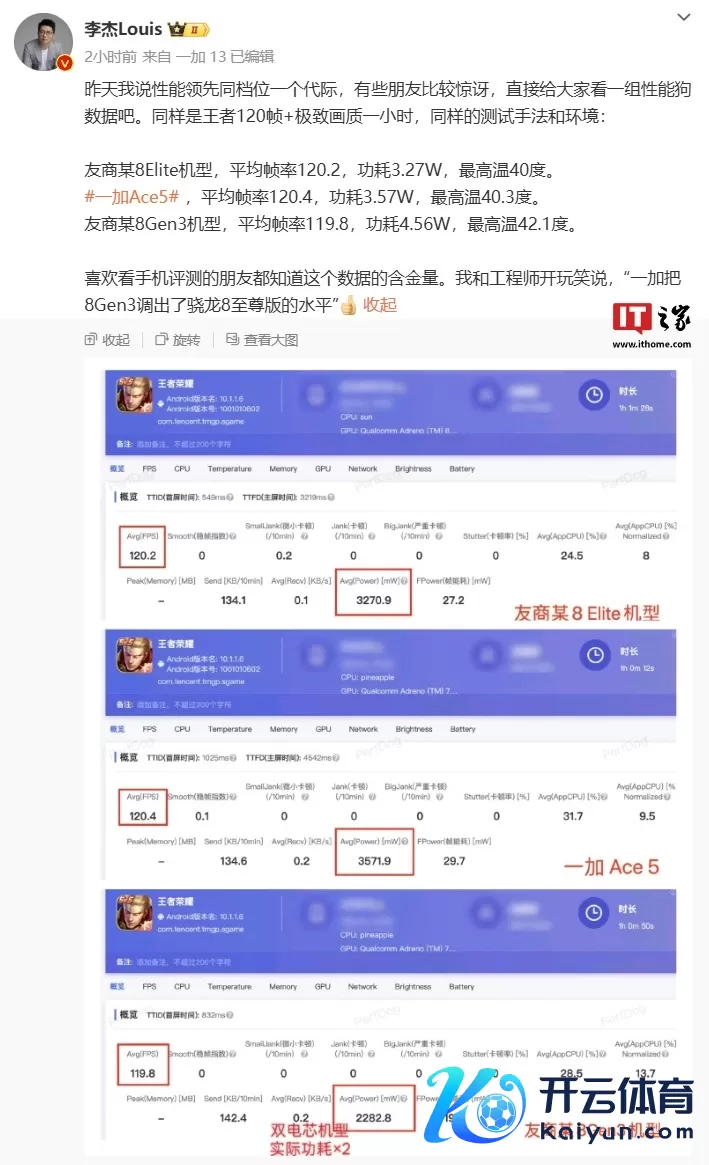 一加中国区总裁李杰当天发文公布了 Ace 5 系列手机玩《王者荣耀》手游的性能发达:在 120 帧 + 极致画质下,一加 Ace 5 手机平均帧率 120.4、功耗 3.57W、最高温 40.3 度。