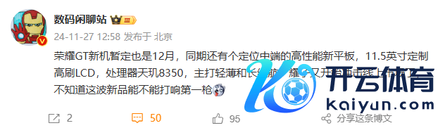 IT之家 11 月 27 日音讯,上个月底,荣耀 CEO 赵明文书其互联网品牌“荣耀 GT”系列转头并成为寥寂居品线,定位“更懂年青东谈主的全新性能科技系列”,首款居品将于年底发布。 @数码谈天站 当天暴露,荣耀 GT 新机瞻望将与荣耀 300 Ultra 一同在 12 月发布,同期还将推出一款搭载联发科天玑 8350 的高性能中端平板电脑新品,接受 11.5 英寸定制高刷 LCD 屏,主打冒失和长续航。 当天早些本事,他还提到荣耀 GT 新机将搭载第三代骁龙 8 惩处器,配备 1.5K LT
