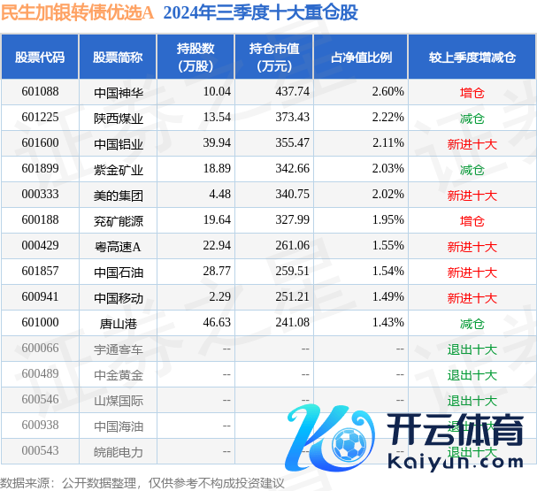民生加银转债优选A为债券型-羼杂二级基金,证实最新一期基金季报泄露,该基金金钱成就:股票占净值比19.95%,债券占净值比111.02%,现款占净值比2.1%。基金十大重仓股如下: