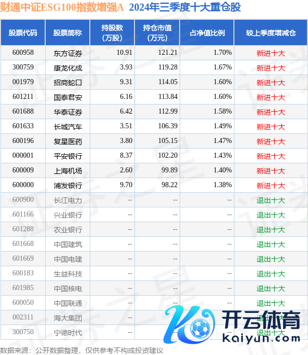 财通中证ESG100指数增强A为指数型-股票基金,阐发最新一期基金季报浮现,该基金钞票建设:股票占净值比94.11%,无债券类钞票,现款占净值比6.44%。基金十大重仓股如下: