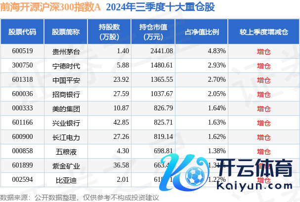 前海开源沪深300指数A为指数型-股票基金,把柄最新一期基金季报浮现,该基金钞票竖立:股票占净值比94.3%,债券占净值比3.59%,现款占净值比2.01%。基金十大重仓股如下:
