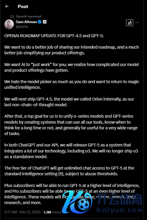 【有关阅读】OpenAI将放大招,GPT-5免费无穷使用开云体育,家具矩阵大整合! OpenAI取消平静发布o3模子 将在改日几个月内推出整合多项技巧的GPT-5 OpenAI首席奉行官奥尔特曼文牍,OpenAI将在改日几个月内推出名为GPT-5的模子,该模子将整合OpenAI的纷乱技巧,包括o3,并运用于聊天机器东说念主ChatGPT以及API平台。 因此,OpenAI不再贪图将o3当作平静模子发布。 凭证奥尔特曼的帖文,在GPT-5推出之前,OpenAI贪图在改日几周内先发布GPT-4.5