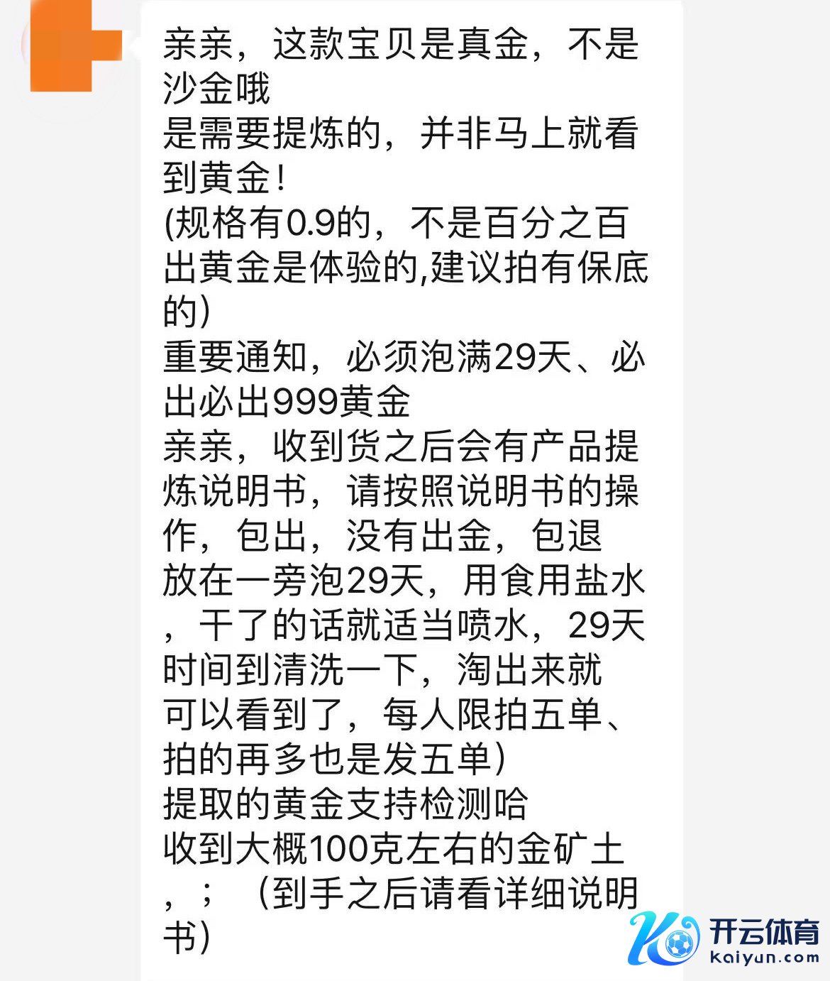记者相关其中一家店铺,客服表现,购买100克“淘金沙”保底出1克黄金。“标注了保底出黄金的商品,必出999黄金”,操作神态是用食用盐水把“淘金沙”泡29天后清洗,就不错看到黄金。客服还称“索求的黄金扶助检测”。